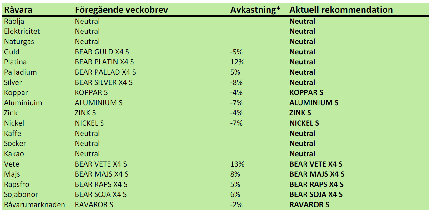 *) Avkastningen avser 1:1 råvarucertifikat där de ingår i rekommendationen. I den aktuella tabellen ovan har jag tagit prisförändringen den senaste veckan sedan det förra veckobrevet publicerades.