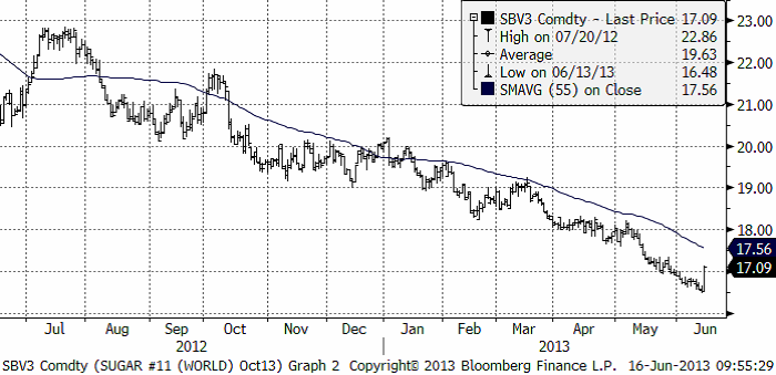 Priset på socker tvärvände uppåt i fredags utan att vi kunde hitta någon bra fundamental anledning till detta. Det som nämns är att ”alla” var sålda terminer och att någon och sedan allt fler började stänga dessa. Rörelsen ser dock signifikant ut ur ett tekniskt perspektiv. Kanske är det så att marknaden börjar närma sig en botten.