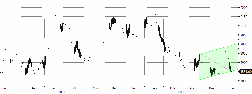 Guldpriset har stabiliserat sig den senaste veckan. Jag väntade mig ett nytt prisfall, men det uteblev. Vi ser istället att en triangelformation har bildats. Formen på den, med en brantare motståndslinje (den övre) än den undre, talar för att utbrottet från triangeln blir uppåt, baserat på erfarenhet. När så många kommentatorer och ”analytiker” är negativa till guldets framtida prisutveckling, skulle det inte heller förvåna om priset rör sig i motsatt riktning, dvs uppåt. Vi väljer därför att kliva av våra korta positioner och vara neutrala.