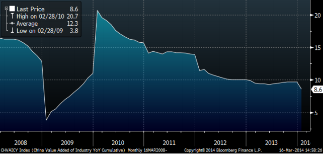 Kinas industriproduktion föll till 8.6% i årstakt i februari enligt statisktik som publicerades i torsdags. Det är ännu en bekräftelse på att landets ekonomi har problem och därmed har de flesta råvarumarknader problem. I diagrammet nedan ser vi förändringen i industriproduktion i Kina på årstakt sedan 2008.