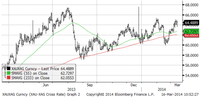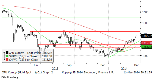 I takt med att tillväxten tvekar såväl i Kina som i USA leder det till ökade förväntningar på monetär stimulans i Kina och mindre avtrappning av den monetära stimulansen i USA. Sådana uttalanden har också kommit från FED, bland annat att takten på ”tapering” kan diskuteras. Konflikten mellan Ryssland och Ukraina och EU:s och USA:s kostnader för att handskas med detta bidrar också till att ge stöd till guldpriset. Oron för en extrem upptrappning av konflikten, även om den har liten sannolikhet påverkar också guldpriset positivt. Guldpriset är känsligt för ändringar i sannolikheten för extrema händelser av den karaktären.