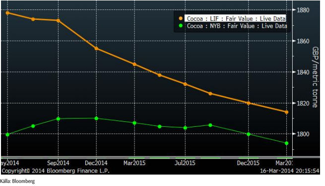 Öppen balans är ungefär lika stor för både LIFFE och NYBOT, men NYBOT har nästan hela sin handel frontmånadskontraktet, vilket återspeglar positioner från indexfonder, som har valt det kontraktet och inte London-kontraktet. Londonkontraktet har en mer spridd handel och används av företag i Europa för prissäkring. Vi ser också att det råder contango i NYBOT-kontraktet för korta löptider (kanske pga long-only-indexfonder) medan det är backwardation i London-kontraktet. Även kakao följer alltså samma mönster som t ex vete, där det råder contango i USA, men backwardation i Europa.