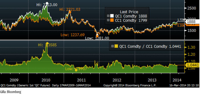 Kakaoterminerna på LIFFE i London handlas normalt sett högre än terminerna på NYBOT i New York. I diagrammet nedan har vi kvoten mellan London-kakao och New York-kakao, omräknat till brittiska pund per ton. Det är spotkontraktet vi ser.