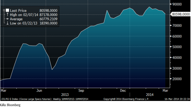 Kakaoterminsmarknaden präglas av en stor kort position i producentledet. Enligt fredagens Commitment of Traders – rapport från CFTC, som visar läget per i tisdags, var producenter korta över 90,000 kontrakt i det amerikanska kontraktet på kakao. Investerare var köpta 80,598 kontrakt. Investerarkategorin har börjat minska sin köpta position, som vi ser i diagrammet nedan. Alla tester visar att kausaliteten går från prisrörelse till agerande hos investerare och inte tvärt om, men bilden visar i vart fall att det positiva sentimentet hos aktörer som inte enbart är ute efter att bli av med risk, utan på att försöka förutspå prisutvecklingen, har blivit lite mindre positivt (även om de fortfarande är mycket positiva).