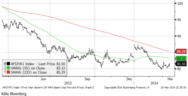 Priset på kol är det enda som visar styrka just nu. EU importerar kol från Ryssland och det kan vara det som påverkar priset, liksom det kan ha gjort för palladium och nickel. 80 dollar är en viktig stödnivå och det är viktigt att den inte bryts.