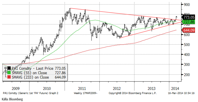 Palladiumpriset tog en paus efter utbrottet förra veckan. Det är ett vanligt marknadsbeteende och man kan dessutom då och då se en rekyl ner tillbaka till utbrottsnivån. Vi tror att palladiumpriset kan stå inför en större prisrörelse uppåt och väntar oss att se bekräftelser på det först genom att passera 785 dollar som var toppnoteringen under 2013.