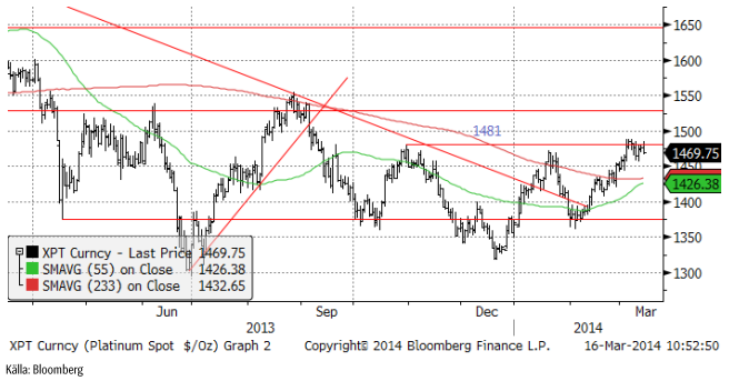 Platina har problem att gå över det tekniska motståndet på 1481 dollar. Den senaste utvecklingen antyder att det finns en risk för en rekyl nedåt.