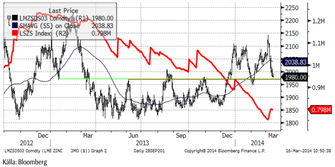Nickel har till skillnad från de andra basmetallerna stigit i veckan. Som vi skrivit tidigare gynnas nickelpriset av oron för Rysslands/Ukraina-krisen. Priset har dock kommit upp till 16,000 dollar och det är en motståndsnivå, där t ex marknaden fann en botten i slutet av år 2012. Vi rekommenderar därför att man går ur långa positioner nu och lägger sig neutral.
