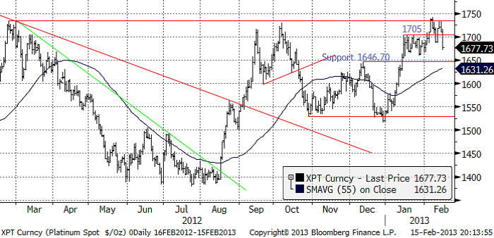 Platinapriset följde guldpriset i veckan som gick, dvs nedåt. I början av veckan bröt platina motståndet på 1705 och gick upp till huvudmotståndet strax under 1750. På den nivån ser vi att det fanns tillräckligt mycket säljare för hejda uppgångarna i februari och mars förra året. Det är uppenbarligen en viktig nivå. Nu har priset fallit så mycket att det ser ut som om priset ska ner till 1650 och hämta kraft. Där skulle man kunna försöka komma in och köpa t ex PLATINA S. Den fundamentala utbuds- och efterfrågesituation för platina skiljer sig väsentligt från guld och silver.