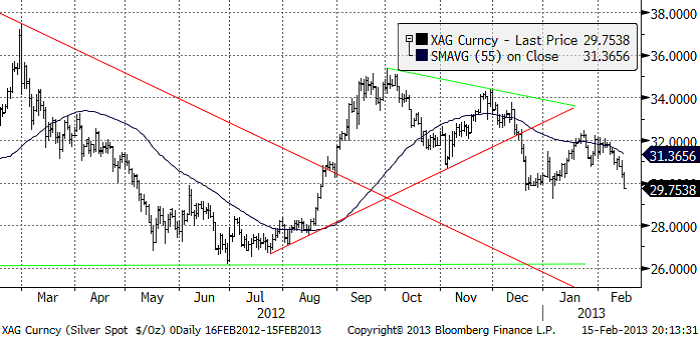 Nedan ser vi kursdiagrammet för silver i dollar per troy ounce. Situationen är snarlik den för guld. Silverpriset befinner sig precis på en nivå där det bör finnas tekniskt stöd, men övertygelsen i de senaste dagarnas kursfall gör att priset kanske faller rakt ner till nästa stöd vid 28 dollar.