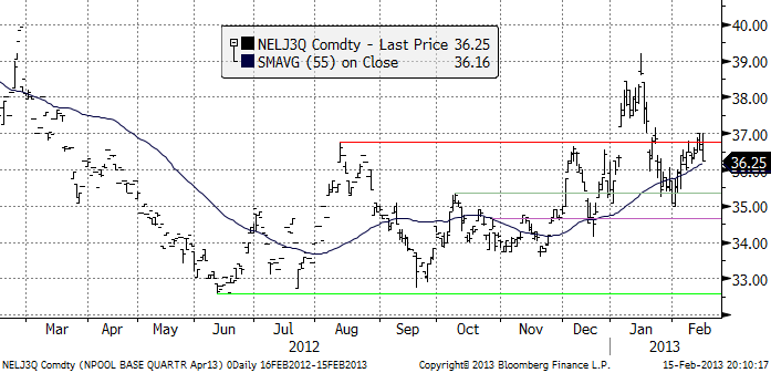 Elpriset steg inledningsvis under veckan, men föll och stängde på dagslägsta i fredags. Det fanns uppenbarligen starka säljintressen på 37 euro per MWh. Det förefaller som om de gav köparna mer än vad de orkade med. Gissningsvis öppnar marknaden ner på måndag igen. Trenden är uppåtriktad och stöd finns på 35 euro, där man kan försöka komma in på den köpta sidan. Vi tror att motståndet på 37 euro kommer att testas igen.