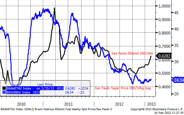 Brasiliens regering vill öka användningen av etanol som drivmedel i landet. Många bilar i landet går att köra på både bensin och etanol, men priserna har varit sådana att folk har valt att tanka med bensin. Den ökade fokuseringen på etanol har fått priset att stiga, som vi ser i nedanstående diagram, som visar etanolpriset i Sao Paulo i USD per liter. Den blå linjen är priset på socker i samma delstat.