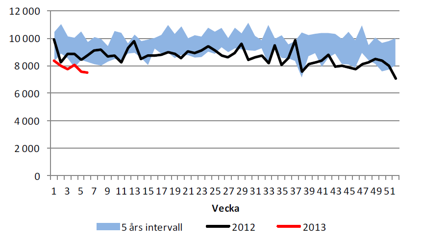 Nedan ser vi amerikanska råoljelager enligt DOE i tusen fat. Den svarta kurvan är 2012 års lagernivåer vecka för vecka och den lilla röda linjen är 2013 års nivå. Vi ser att lagernivåerna fortsätter att vara högre än de varit sedan 2007 för den här tiden på året.