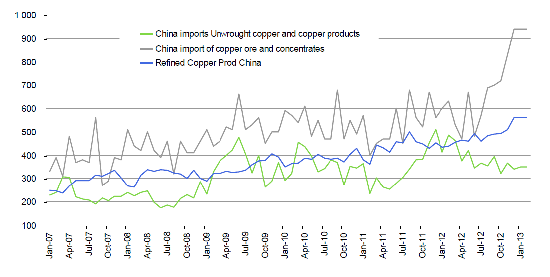 Vi skrev i förra veckans brev om Kinas importsiffror som kom in på 350 958 ton, + 2,9 % i januari jämfört med december. Jämfört med januari förra året föll importen med 15,2 % (se månadsstatistiken nedan). Trenden är fallande under året. Möjligtvis anas en tendens till ”urbottning”. I grafen nedan har vi lagt in importen kopparmalm, vilket nyanserar analysen. Den sjunkande importen av ”obehandlad” koppar har kompenserats av en ökad import av malm, och som vi ser i grafen behålls en oförändrad ganska hög inhemsk produktion. Internt i Kina kompenseras således den minskande importen av inhemsk produktion. Den positiva tolkningen av detta är att Kina kommer att behöva koppar (trots minskad import). Den negativa tolkningen är att den ökade malmimporten är ytterligare ett tecken på ökat utbud av kopparmalm.