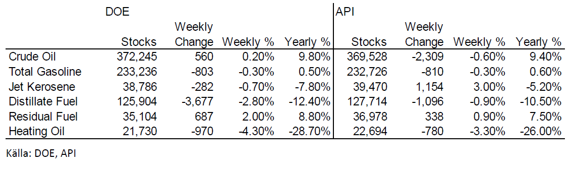 Det var inga stora förändringar. Destillat och eldningsolja har betydligt lägre lager än förra året. Råoljelagren fortsätter att byggas på och produkternas lager minskar.