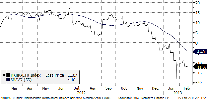 Den hydrologiska balansen för NordPools börsområde sjönk något och ligger enligt Markedskraft på -11.87 TWh.