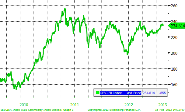 I diagrammet nedan ser vi SEB:s råvaruindex, som följer avkastningen på en diversifierad korg av råvaruterminer. Sammansättningen är gjord med tanke på en nordisk eller europisk placerare. Indexet innehåller t ex terminer på nordisk och tysk el, men ingen amerikansk naturgas. Indexet har slagit DJ UBS index med 8 procentenheter per år, vilket är statistiskt signifikant (p=0.11), förutom att vara tämligen ekonomiskt signifikant.