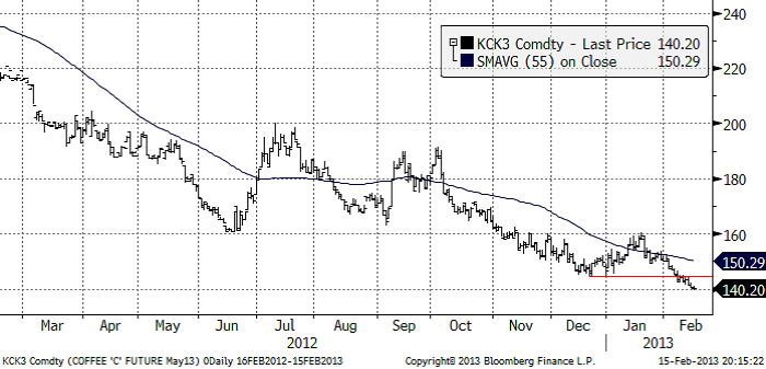 Kaffepriset (maj 2013) nådde en ny kontraktslägsta i veckan. Tekniskt är trenden nedåtriktad, då det inte blev något trendbrott (över 160 cent i majkontraktet) och stödet på 145 cent inte höll. Eftersom det är en så jämn siffra utgör 140 cent nu ett stöd i sig självt. Vi ser kursutvecklingen det senaste året i diagrammet nedan.