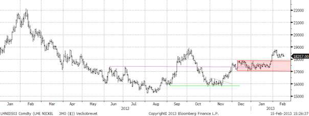 Som vi tidigare skrivit kan dock nickel erfarenhetsmässigt ofta överraska. Den tekniska bilden är väldigt tydlig med nästa motståndsnivå vid $19000 och därefter $22000. För den som följde rådet att ta hem vinst för två veckor sedan, kan det vara värt att gå in igen kring ”utbrottspunkten” $18000 med ett nytt köp.