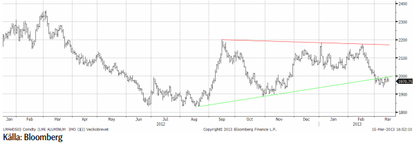 Aluminiumpriset har till stor del följt kopparn under veckan, som avslutas med en positiv veckoförändring på ca 1 %. Som vi skrivit tidigare ligger aluminium väldigt ”fast” i ett relativt stort handelsintervall. Nivåer kring $1800-1900 utgör ur ett kostnadsperspektiv starkt stöd. Samtidigt lägger det stora utbudet ett ”tak” på nivåer kring $2300. Den senaste uppgången i februari mötte stora säljordrar från producenter som passade på att ”låsa” framtida priser, vilket satte press på marknaden. Nu när priserna fallit tillbaka ser vi stora intressen från köpsidan (fysiska förbrukare). För den ”trading-benägne” utgör det stora spannet goda vinstmöjligheter.