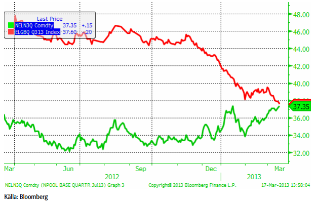 Nedanför ser vi prisutvecklingen för det tredje kvartalets tyska elpriskontrakt (röd) och Nord Pools tredje kvartalskontrakt (grön). Det tyska priset har fortsatt att falla och det nordiska att stiga. Det är nu bara 25 eurocent som skiljer priserna åt.