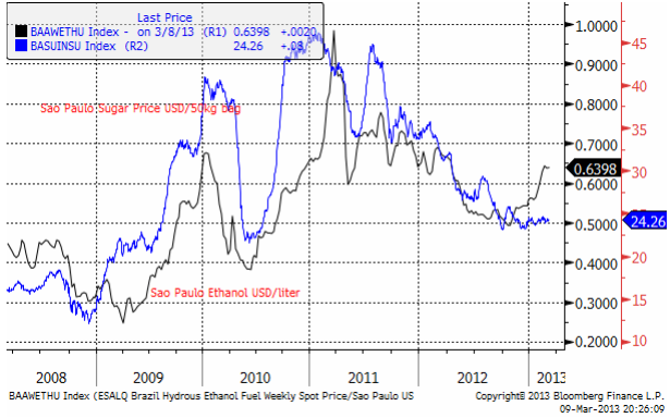 Brasiliens regering vill öka användningen av etanol som drivmedel i landet. Många bilar i landet går att köra på både bensin och etanol, men priserna har varit sådana att folk har valt att tanka med bensin. Den ökade fokuseringen på etanol har fått priset att stiga, som vi ser i nedanstående diagram, som visar etanolpriset i Sao Paulo i USD per liter. Den blå linjen är priset på socker i samma delstat.