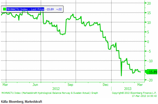 Det är en kall och torr vår gör sommaren kort, skrev Lars Wivallius år 1642. Den hydrologiska balansen för Nord Pools börsområde har sjunkit ytterligare från -14.66 TWh till -15.89 TWh.