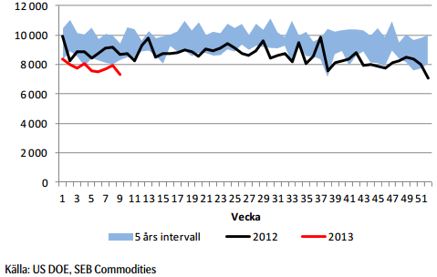 Nedan ser vi amerikanska råoljelager enligt DOE i tusen fat. Den svarta kurvan är 2012 års lagernivåer vecka för vecka och den lilla röda linjen är 2013 års nivå. Vi ser att lagernivåerna fortsätter att vara högre än de varit sedan 2007 för den här tiden på året.