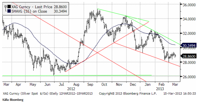 Nedan ser vi kursdiagrammet för silver i dollar per troy ounce. Även här har priset rört sig ”sidledes” den senaste månaden och bygger upp fallhöjd om priset ska följa den inslagna trenden nedåt.