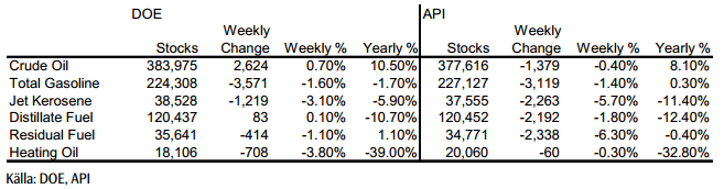 Lagren och lagerförändringarna i USA per den 8 mars ser vi nedan, enligt Department of Energy och American Petroleum Institute.