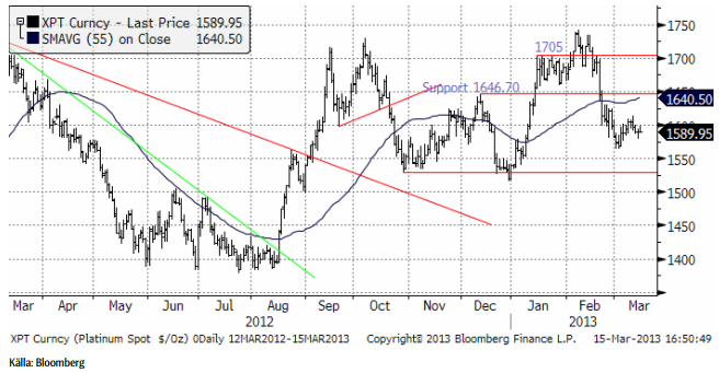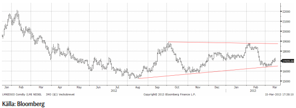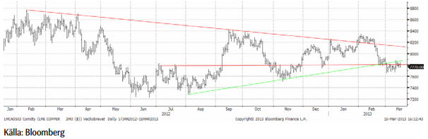 Den tekniska bilden ger stöd till vår neutrala position. Vi är positiva till basmetaller på sikt men avvaktar bättre köptillfällen på koppar, alternativt väljer någon annan basmetall. Den stora triangelformationen börjar spela ut sin roll. Stödnivåer noteras vid 7600 och 7400. Nivån 7800 fungerar nu som motstånd.