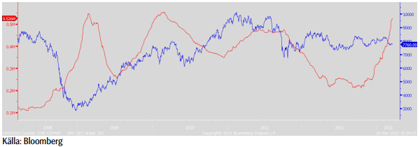 Koppar pris/lager (pris blå linje/LME-lager röd linje)
