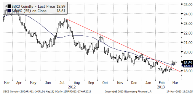 Sockerpriset (maj 2013) som brutit den nedåtgående trenden rent tekniskt fortsätter att testa 19 cent. I fredags försökte marknaden handla upp priset, men när dagen var slut stängde priset på 18.89 cent per pund. Vi har tidigare skrivit att priset på etanol i Brasilien har gått upp – vilket drar med sig priset på socker. Under majs (nedan) ser vi också att priset på etanol i USA har stigit stadigt, vilket är en faktor bakom stödet för majspriset. Det är också en stödjande faktor för sockerpriset.
