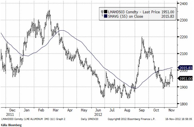 Aluminium har varit i blickfånget under veckan. Priset stänger veckan upp 1,5 % på $1950 efter att ha varit uppe och nuddat vid $2000. Rykten i början av veckan om Kinas strategiska köp av 400 tton, fick priset att stiga kraftigt. Torsdagens bekräftade köp av 100 tton (som enligt uppgift kommer att följas av tre poster till), fick aktörerna att ta hem vinster med påföljande rekyl. Den tekniska bilden ser mer positiv ut för aluminium och långsikta tekniska analyser tyder på en ”urbottningsfas”. Om priset kommer ned till $1900 igen är det köpläge. Potentialen är ganska stor. Priset var så sent som i september uppe i $2200 (12 % högre).