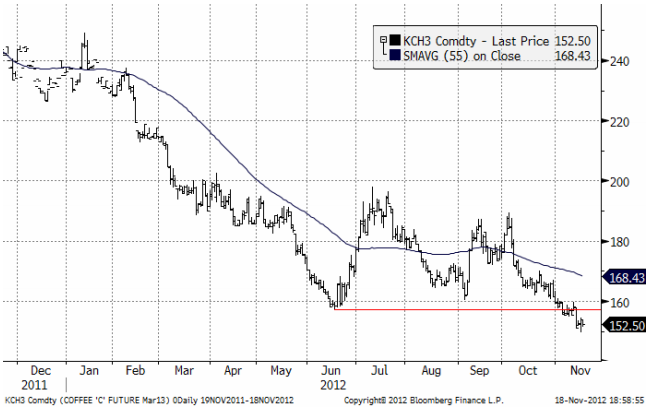 Kaffepriset (mars 2013) som förra veckan konsoliderade sig under en motståndsnivå, föll i veckan som gick ner från den nivån. Detta innebär att den negativa trenden har fortsatt. Det finns inget, tekniskt, som pekar på att trenden ska vända uppåt.