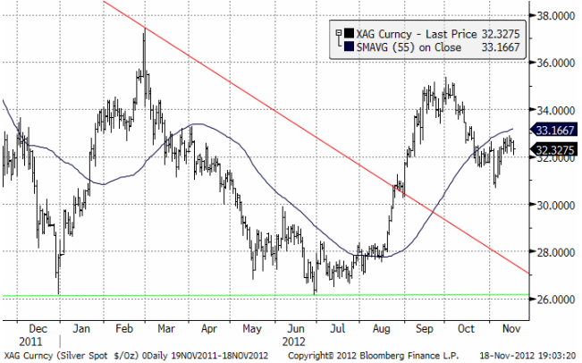 Nedan ser vi kursdiagrammet för silver i dollar per troy ounce. Situationen är identisk med den för guld.