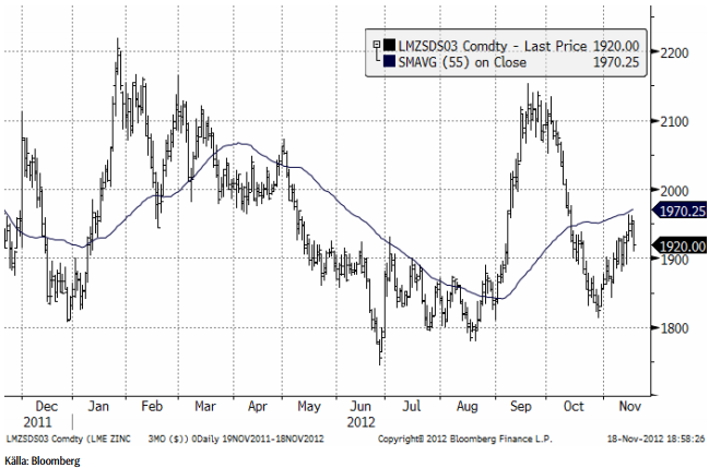 Koppar och nickel stänger veckan marginellt ned medan zink och aluminium är upp 0,8 % respektive 1,5 %. Marknaderna står och väger. Förväntad återhämtning av tillväxten i Kina motverkas av oro för amerikanska budgetförhandlingar och svagare industrikonjunktur i Europa. Den uppblossade konflikten på Gazaremsan har förstärkt oron för ett fullskaligt krig i regionen.