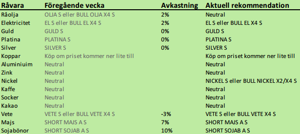 Vi inleder bevakningen av Nickel med en köprekommendation. Majs och sojabönor föll förra veckan, vilket fick våra positioner i SHORT-certifikat att utveckla sig väl. Guld, silver och platina tyngs av en stark dollar. Vi tror att dollarn kan fortsätta att stärkas. Detta innebär att noteringarna i dollar kan bli lägre, men då inte nödvändigtvis i svenska kronor. Vi går över till neutral rekommendation på olja, efter förra veckans prisuppgång. Vi är alltjämt positiva till elpriset och rekommenderar köp av t ex EL S.