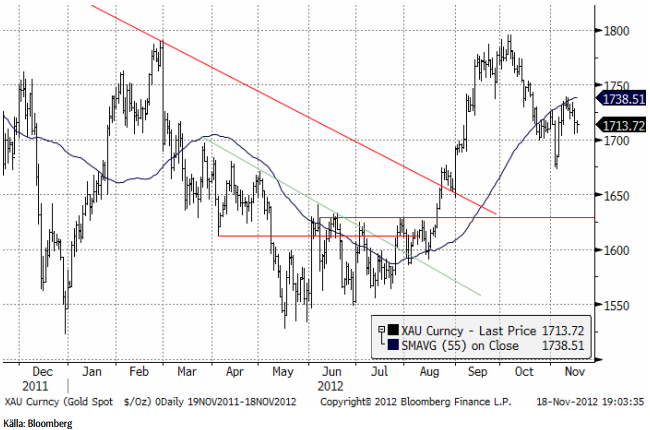 Veckan som varit har präglats av oro för – och nedjusteringar av efterfrågan, vilket tyngt priset. Samtidigt har det varit förnyad geopolitisk oro, där Israels försvar mot Hamas raketbeskjutningar är det senaste tillskottet. Situationen i och kring Syrien med potentiella spridningsrisker till grannländer som Turkiet och inte minst Israel, utgör ytterligare hot. Balansen mellan utbud och efterfrågan är mindre ansträngd efter de senaste nedjusteringarna av efterfrågan samt starka produktionssiffror från länder som Irak och Libyen. I nuvarande miljö minskar det risken för oljepriser över 120 USD/fat. Samtidigt utgör situationen i Mellanöstern med ovan nämnda oroshärdar samt den nyuppblossade konflikten mellan Israel och Hamas och de pågående sanktionerna mot Iran, en risk. Blir det en större eskalering av någon av konflikterna kan priset på olja snabbt rusa.