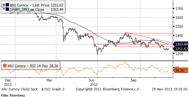 Guldpriset (i dollar), som för ett par veckor sedan föll under den tekniska stödnivån på 1273, har sedan dess rört sig förvånande lite.