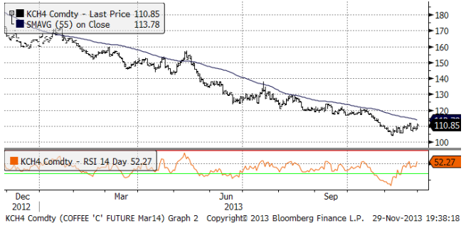 Kostnaderna väntas stiga från en nivå 2012/13 på 122 cent per pund till 134 cent per pund. Det innebär att priset ligger under en nivå där 50% av kaffeproducenterna i Brasilien gör förlust. Det är naturligtvis en ohållbart låg prisnivå. Den som vill läsa rapporten kan göra det här.