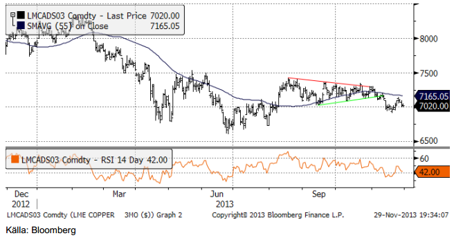 Från en teknisk synvinkel ligger koppar och zink fortfarande över de lägsta priserna från sommaren, medan nickel ligger nära botten. Aluminium sticker ut genom att nu handlas på fyra års lägsta pris de senaste två dagarna. Vi tror att marknaden är överdrivet såld och tillflöde av nya säljare för att på riktigt trycka ner priset ytterligare. Vi håller fast vid åsikten att marknaden diskonterar en allt för pessimistisk framtid. Vi tror att det finns utsikter för en ordentlig rekyl uppåt innan nyår. Den säsongsmässigt starka perioden ligger framför oss. December / januari brukar vara starka månder vad gäller priset.