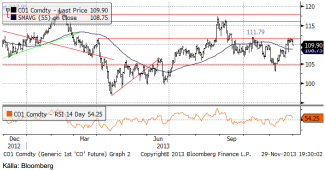 Oljepriset gick hela vägen upp till det gamla tekniska motståndet på 111.79 dollar per fat, innan det vände ner igen. SEB har uppdaterat sin prognos för oljepriset. Både för det första kvartalet och det andra nästa år, tror bankens oljeanalytiker på ett pris på 100 dollar per fat. De faktorer som bidrar till ett lågt pris är den stadigt ökande produktionen i USA, som innebär att mer olja blir kvar på världsmarknaden i kombination med fortsatt, förhållandevis, låg tillväxt i tillväxtländer.