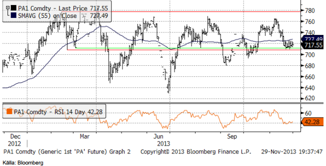 Priset på palladium har funnit stöd på 710 dollar per uns. I dagsläget är det omöjligt att säga om den konsolidering som skett vid den nivån kommer att följas av ytterligare en nedgång eller om det blir en rekyl uppåt.