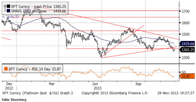 Platinapriset borde ha stöd från strejkerna i Sydafrika, men har det inte. Den triangelformation som etablerats i prisutvecklingen sedan botten i juni, har nu brutis på nedsidan, vilket indikerar att trenden fortfarande är nedåtriktad.