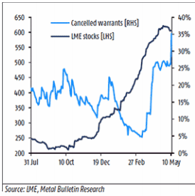 Ett annat tecken är förändringen av LME-lagret. Vi ser både lagerminskningar och en ökning av ”cancelled warrants”. Det senare är statistik på mängden material som är på väg att plockas ur lager. Uttagen sker i Sydkorea och tyder på ökad efterfrågan – sannolikt med destination Kina. Detta stämmer överens med den förväntade ökningen av importen till Kina. Kineserna brukar utnyttja prisskillnaden mellan LME och Shanghai, som nu efter prisnedgången är till LME:s fördel.