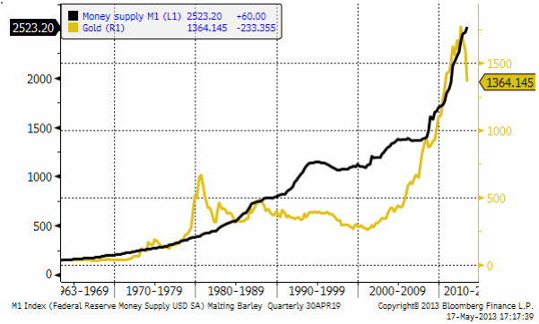 Vad som kan ha utlöst försäljningarna var ”hacket” i kurvan på penningmängden i USA. Samtidigt började FED tala om ett slut på QE. Men som vi ser i grafen nedan, har M1 fortsatt att öka i USA. Man fick kalla fötter hos FED och fortsatte trycka pengar. Det gör att det byggs upp ett latent stöd för guldpriset, bara kursfallet tar slut.