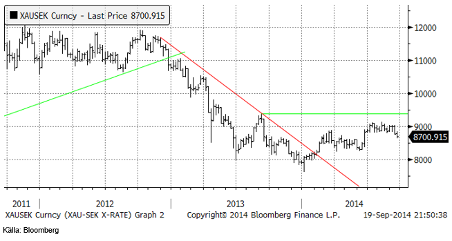 Chartet för guld i kronor (och i euro med för den delen) som jag förra veckan skrev att det närmast ser ut som en omvänd head-and-shouldersformation, alltså en positiv formation, ser ändå på kort sikt ut att kunna ge ytterligare lägre pris i veckan som kommer.