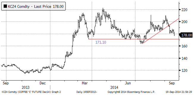 Regn över Minas Gerais gav prisfall på kaffet och regnet fortsätter, som vi såg av väderleksprognosen för Brasilien ovan. Det finns många analyser som haussar kaffe, men vi hör inte till dem. Tekniskt ser priset ut att vara på väg ner mot det tekniska stödet på 171.10 cent. Det bröts i och för sig i juli, så priset kan gå ännu lägre i det korta perspektivet, kanske ända till drygt 160 cent.