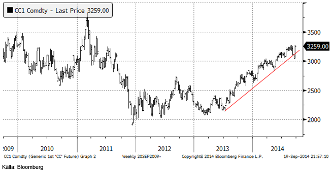 Allt hade varit frid och fröjd med en kort position i kakao om det inte kom rapporter om att Ebola-smittan kan drabba Elfenbenskusten och Ghana, de två viktigaste producenterna av kakao i världen. Hittills finns inga rapporterade fall av Ebola från dessa länder, men det kan finnas ”inofficiella fall”. Både Ghana och Elfenbenskusten exporterar kakao i större volymer än vad marknadsbedömare räknat med. Om Ebola-smittan kan begränsas eller inte når Elfenbenskusten eller Ghana, finns nog stor fallhöjd i priset på kakao.